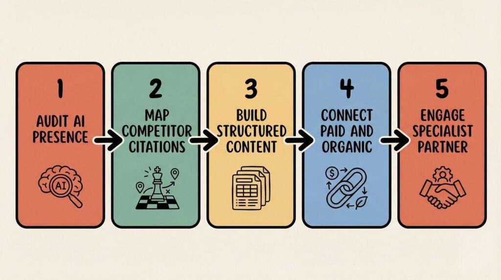 1. Audit your AI search presence today. Ask ChatGPT, Perplexity, and Gemini about your product category. Note whether your brand appears in any answers.